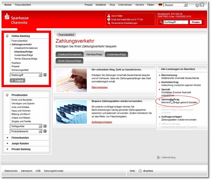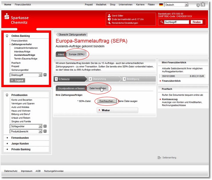 10. Im Zahlungsverkehr Ihres Online-Bankings (hier im Beispiel: Sparkasse) wählen Sie die entsprechende Datei aus.