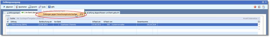 12. Mit [F9] oder über den Menüeintrag "Tools > Zahlungen gegen das Verrechnungskonto buchen" können diesen Stapel nun verbuchen.