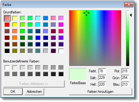 Innerhalb der Dialoge "Tagesdefinition" und "Terminkategorien" können mittels der Feldauswahl neben den Grundfarben der Palette weitere Farben definiert werden.