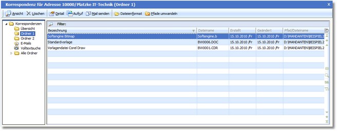 Die Auswahltabelle zeigt den Inhalt des in der Baumauswahl markierten Ordners an. Sie sehen eine Liste der Korrespondenzdateien, die mit der Adresse verknüpft sind.