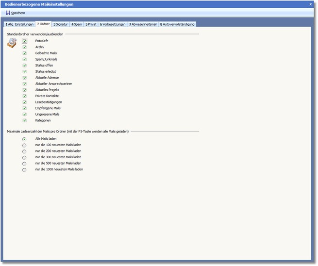 << Hier KLicken um eine Inhaltsübersicht anzuzeigen >> Navigation: CRM/OfficePlaner > Mailsystem > Mail einrichten > E-Mail-Assistent - Extras > Bedienerbezogene Einstellungen > Die Karteikarte "Ordner" |