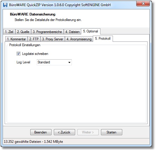 Hier kann festgelegt werden, ob und in welchem Maße der Log während des Sicherungsvorgangs geschrieben wird.