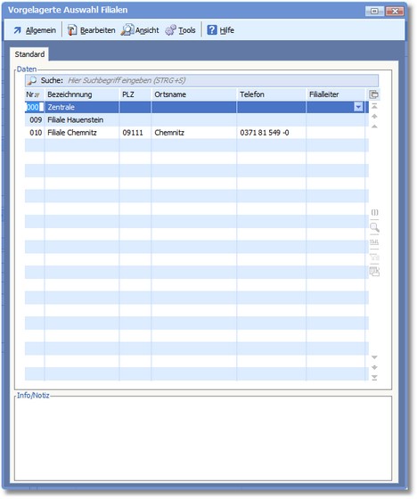 Das Programm öffnet die vorgelagerte Auswahltabelle der Filialen.