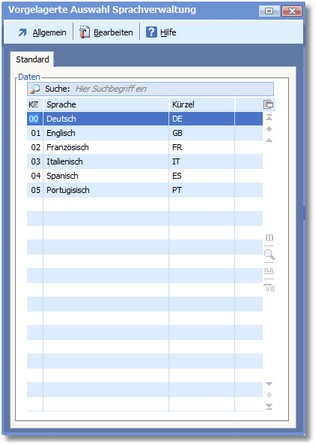 Das Programm öffnet die vorgelagerte Auswahltabelle der Sprachverwaltung.