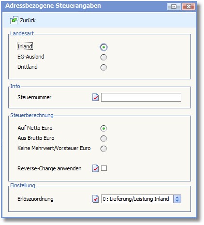 << Hier KLicken um eine Inhaltsübersicht anzuzeigen >> Navigation: Warenwirtschaft > Stammdaten > Adressstamm > Adressen erfassen/ändern > Die Karteikarte "Standard" (Firma) > Adressbezogene Steuerangaben |