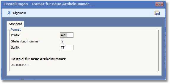 Format für neue Artikelnummer Öffnet ein Dialogfenster, in dem das Format der Artikelnummer bearbeitet werden kann.