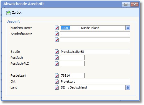 Zusätzlich kann der Adresse für das Projekt eine abweichende Adresse zugewiesen werden. Wird hier keine abweichende Adresse eingetragen, werden die in den Stammdaten der Adresse hinterlegten Daten verwendet.