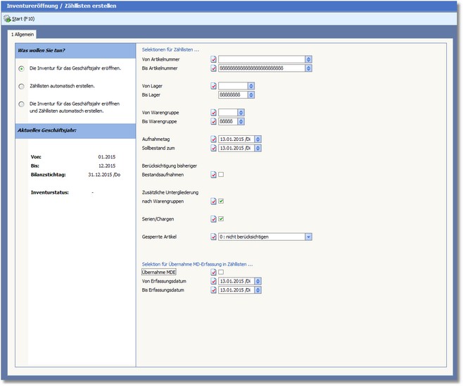 Als erster Schritt im Inventurablauf werden zunächst die Inventur eröffnet und die Zähllisten erstellt. Sie können dies je nach gewählter Option einzeln oder in einem Arbeitsschritt ausführen.