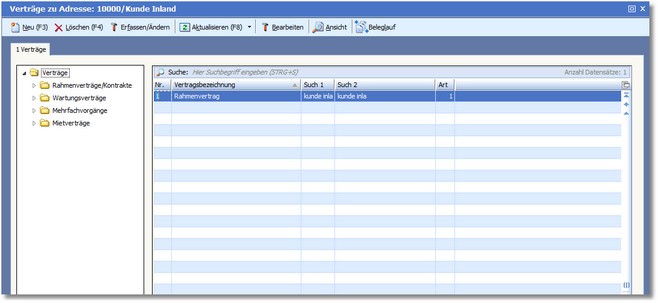Das Programm öffnet die Vertragsverwaltung für den Kunden Inland mit Zahlungskondition und Lieferadr..