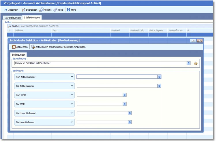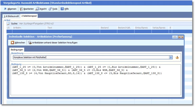 Es soll über Platzhalter eine komplexe Selektion aufgebaut werden, in der Von/Bis Artikelnummer, Von/Bis Warengruppe und Von/Bis Hauptlieferant selektiert werden soll.