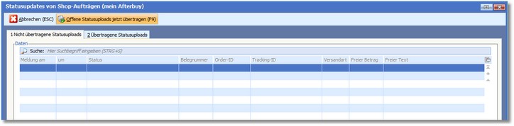 In dieser Tabelle, die über den Menüeintrag "Extras > Statusupload an (Marketplacename) geöffnet wird, werden alle Shopmeldungen des ausgewählten Marketplaces in einer Tabelle aufgeführt.