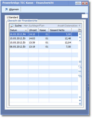 << Hier KLicken um eine Inhaltsübersicht anzuzeigen >> Navigation: BüroWARE Powerbridge > TEC-Kassenschnittstelle > Finanzbericht |