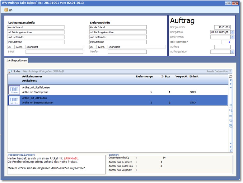 In diesem Dialogfenster werden alle Auftragsdaten sowie die zugehörigen Artikelpositionen mit dem aktuellen Bearbeitungsstatus in der Packstation angezeigt.