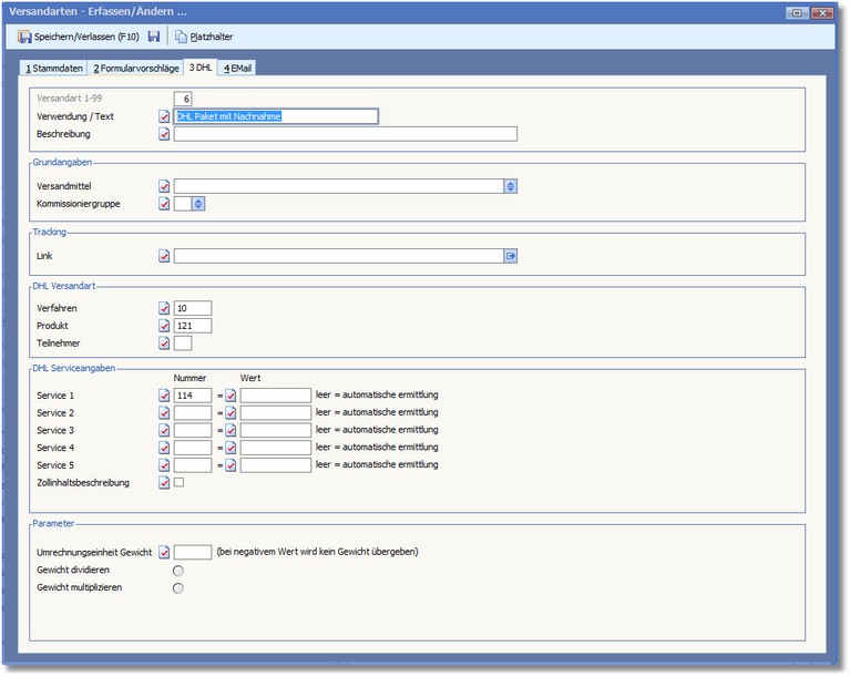 Firmenstamm Versandarten - Karteikarte 3, "DHL"